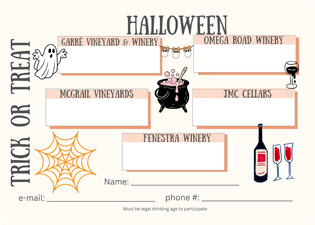 Free to attend. Bring your own Halloween decorated glass and a print out of this card. Some wineries may have extra cards printed out but not guaranteed.